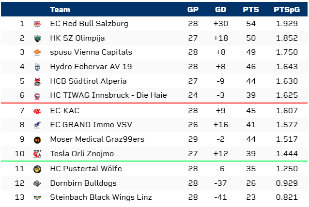 Sorry, aber warum muss man jetzt so Panik schieben? Weil man nicht konstant ist? (Das sind 90% der anderen Teams auch nicht)? Weil man gegen Dornbirn "nur" 5:1 und gegen Innsbruck "nur" im Penaltyschießen gewonnen hat und in Wien "nur" 2 Tore gemacht hat? Oder weil man gegen den KAC 4:0 verloren hat und gegen Graz und Laibach mit einem Tor Unterschied?