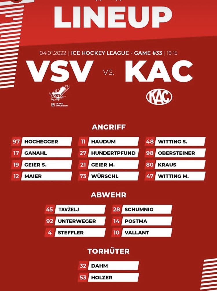Nicht dabei sind heute: Petersen, Koch, Bischofberger, Sticha, Tičar (alle verletzt), Strong (gesperrt) und Fraser (krank). Lukas Haudum wurde rechtzeitig gesund, er centert die erste Sturmlinie mit Fabian Hochegger und Samuel Witting.