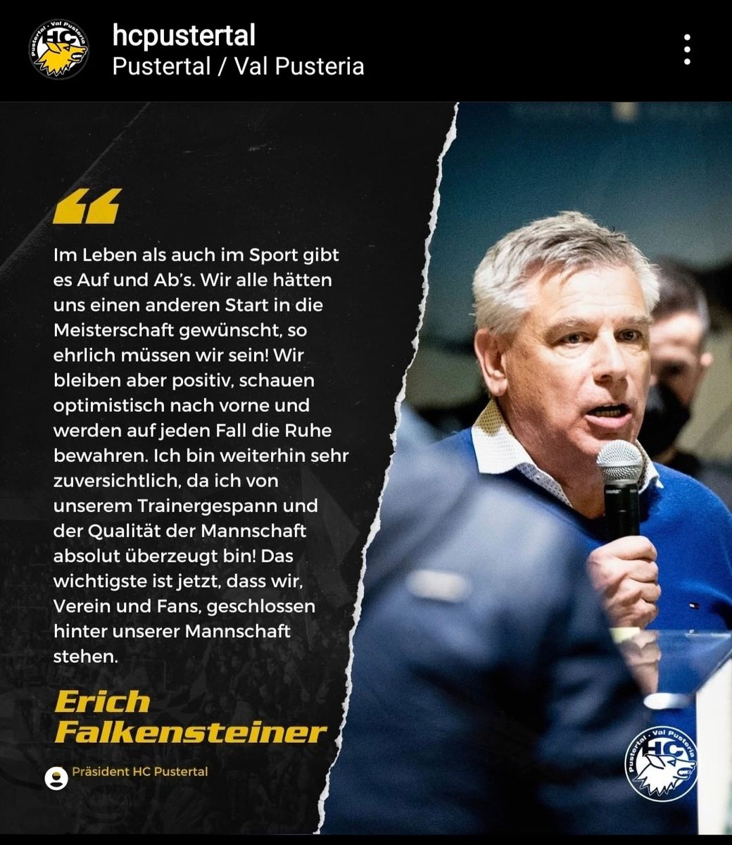 Allgemeines Problem im Pustertal: Die Erwartungen sind einfach zu hoch. Die Erwattungen an den Verein und dieses Jahr wahrscheinlich eben auch die Erwartungen an Mair. Nach 4-5 Niederlagen ist der Verein fast schon zu handeln gezwungen damit noch Zuschauer ins Stadion kommen.