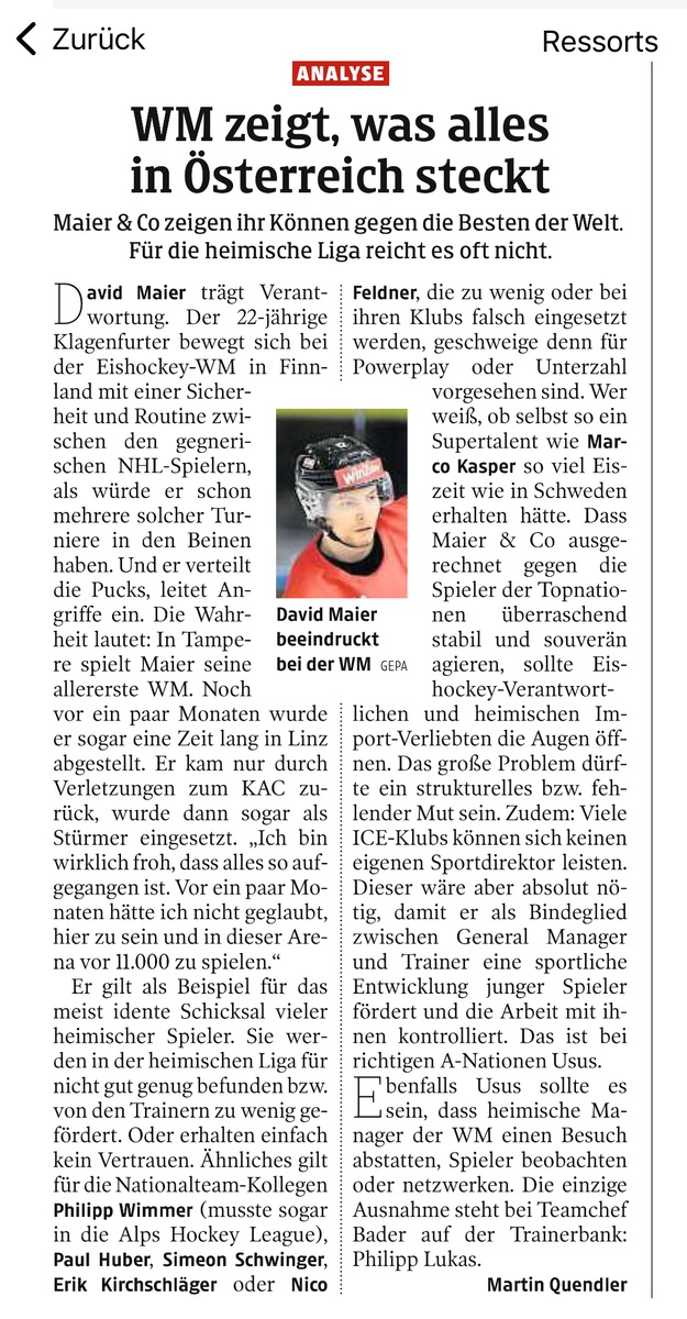 finde den Artikel auch nicht berauschend. Ganz allgemein find ich das was Maier beim Nationalteam zeigt aber ausgesprochen vielversprechend und ich bin echt sehr gespannt auf seine nächste Saison beim KAC.