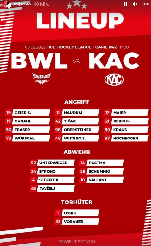 Bin schon neugierig, ob der KAC auch heute wieder einen Weg finden wird, das Spiel zu verlieren. Sollte natürlich nicht sein, aber der KAC hat gerade erst vor 10 Tagen bei der blamablen Heimniederlage gegen Dornbirn bewiesen, dass man auch gegen Tabellennachzügler leider nicht fix mit einem Punktezuwachs rechnen darf. Wenn die kommenden beiden Partien gegen Linz nicht 6 Punkte bringen, hat man allerdings in den Top 6 sowieso nichts verloren.