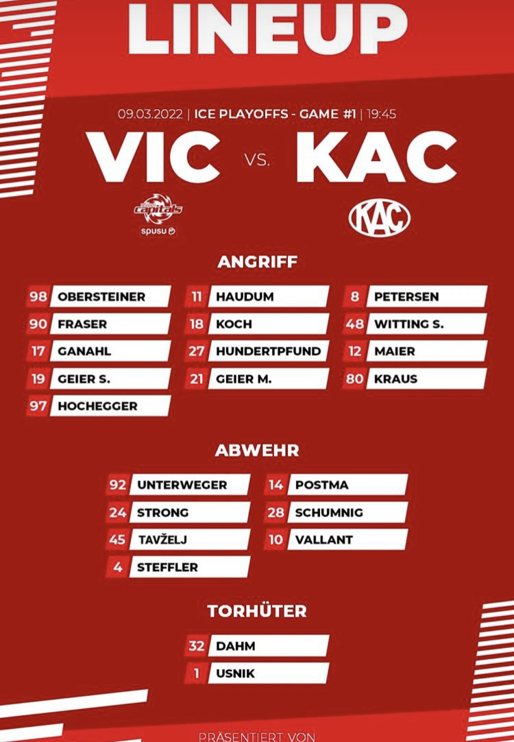 Auch wenn ich glaube, dass Ticar mehr abgehen wird, als viele Kommentare von KAC Fans in den letzten Wochen vermuten lassen, bringen wir noch immer eine Mannschaft aufs Eis, die sich vor den Wiener nicht verstecken muss. Wenn ich einen Hundertpfund, Ganahl, Haudum habe und den nicht mitzähle, darf ich zb. einen Neal auf der anderen Seite auch nicht aufzählen. Für unser Powerplay ist es aber natürlich ein Problem. Bin auf die Zusammenstellung der Linien heute gespannt.