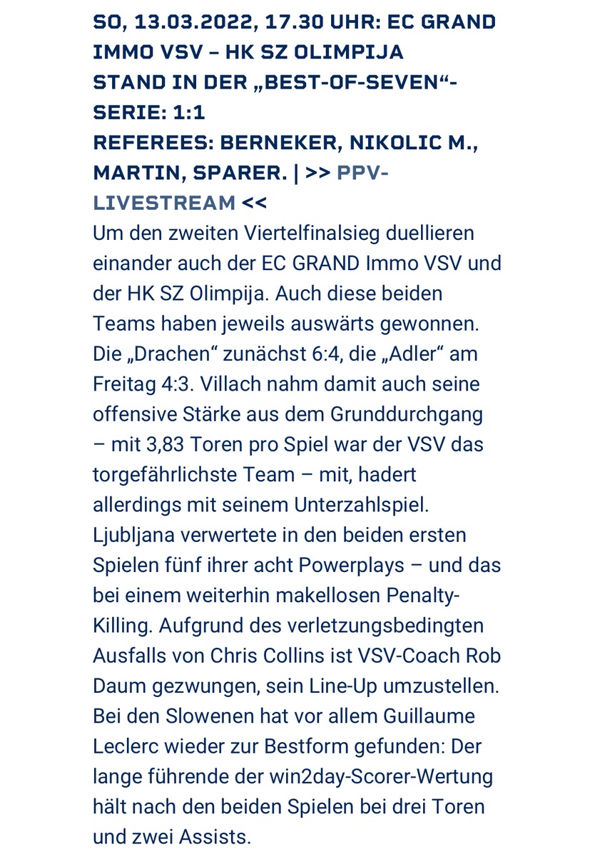 3. PO VF - EC Grand Immo VSV - HK SŽ Olimpija Ljubljana, 13.03.2022, 17:30.
