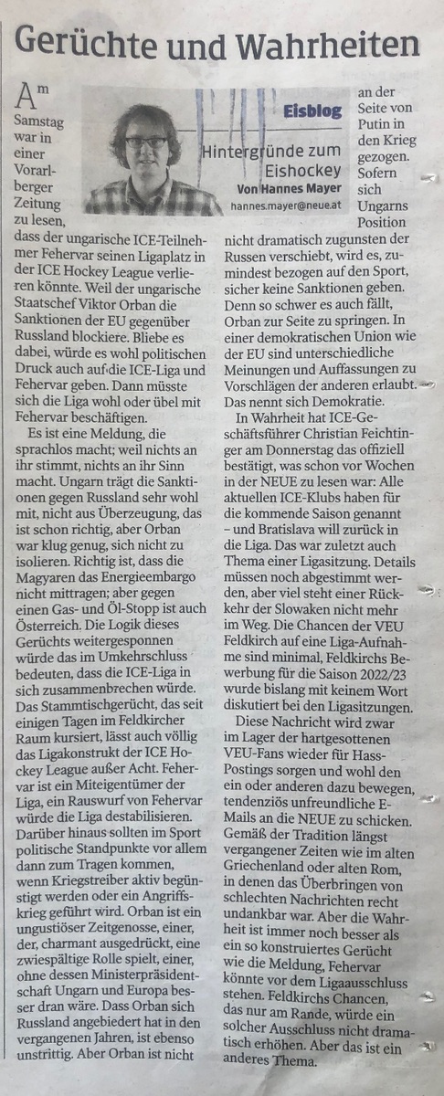 Eisblog aus der heutigen Neuen. Geht um Fehervar, Bratislava, Feldkirch