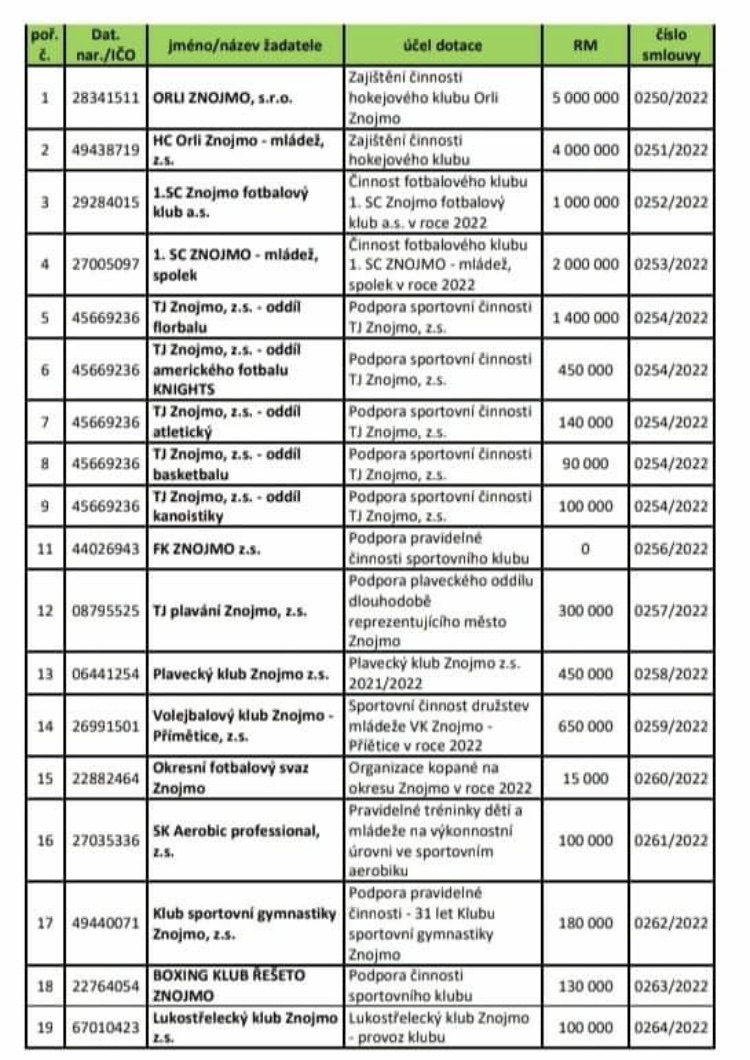 Im Anhang die Verteilung der Gelder an die einzelnen Sportvereine in Znojmo.