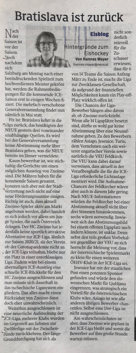 Ich würde mir auch so gerne Jesenice wieder zurück in die Liga wünschen! Die Frage ist halt, wie realistisch das ist. Wenn sie einen ähnlichen weg wie Laibach einschlagen (viel Einheimische, wenig Legionäre), könnte das wohl was werden. Die frage ist halt, wie viele ICE taugliche Slowenen noch verfügbar sind. Es sind ja auch ein paar von Jesenice nach Laibach für die ICE Teilnahme gewechselt. Und außerdem glaube ich, dass wir den einen oder anderen Slowenen von Laibach in einen anderen ICE Club nächste Saison sehen werden..