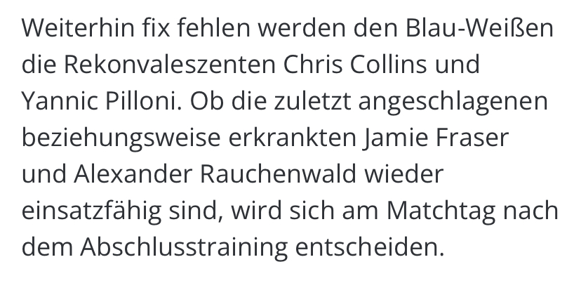 war das nicht sogar schon fix dass beide wieder spielen? Halte ich für extrem wichtig, dass wir da vollzählig antreten, Fraser und Rauche gehen schon ab. Rauche vl. nicht als Individualist, aber die 3. Linie funktioniert noch weniger wenn er nicht dabei ist.