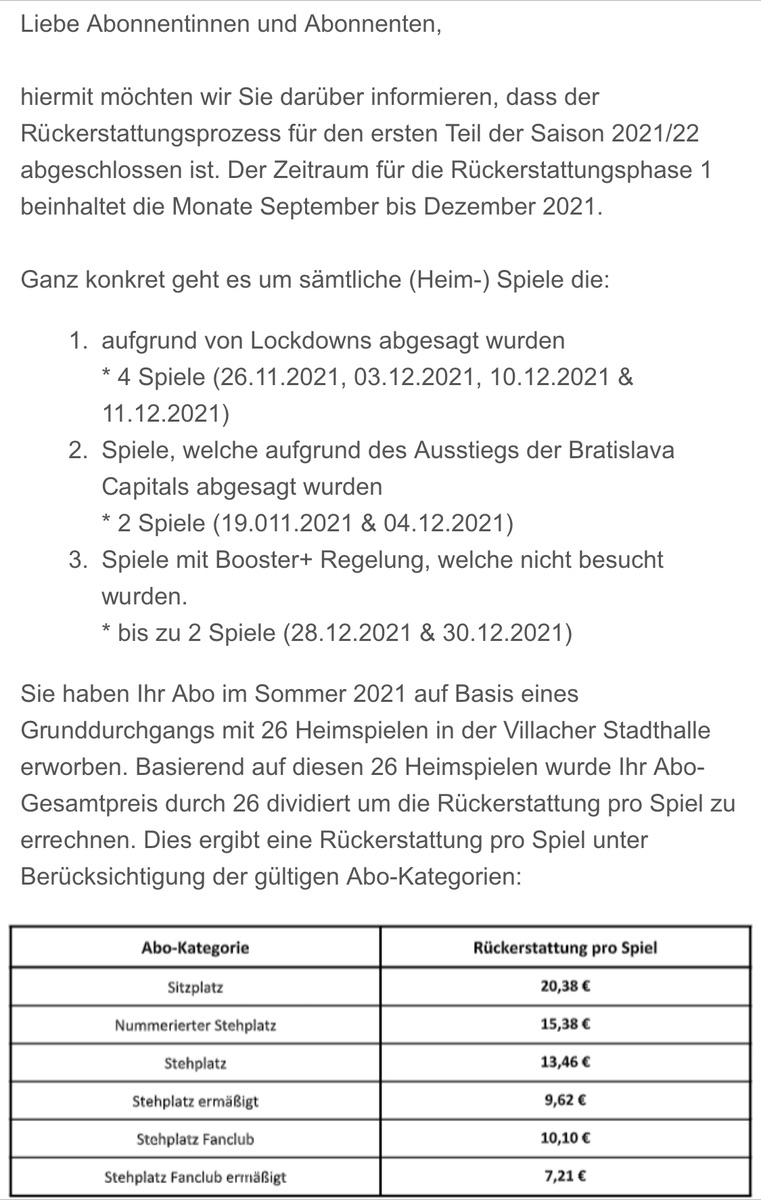 Gerade ist eine email bezüglich der Rückerstattungen der letzten Saison raus gegangen