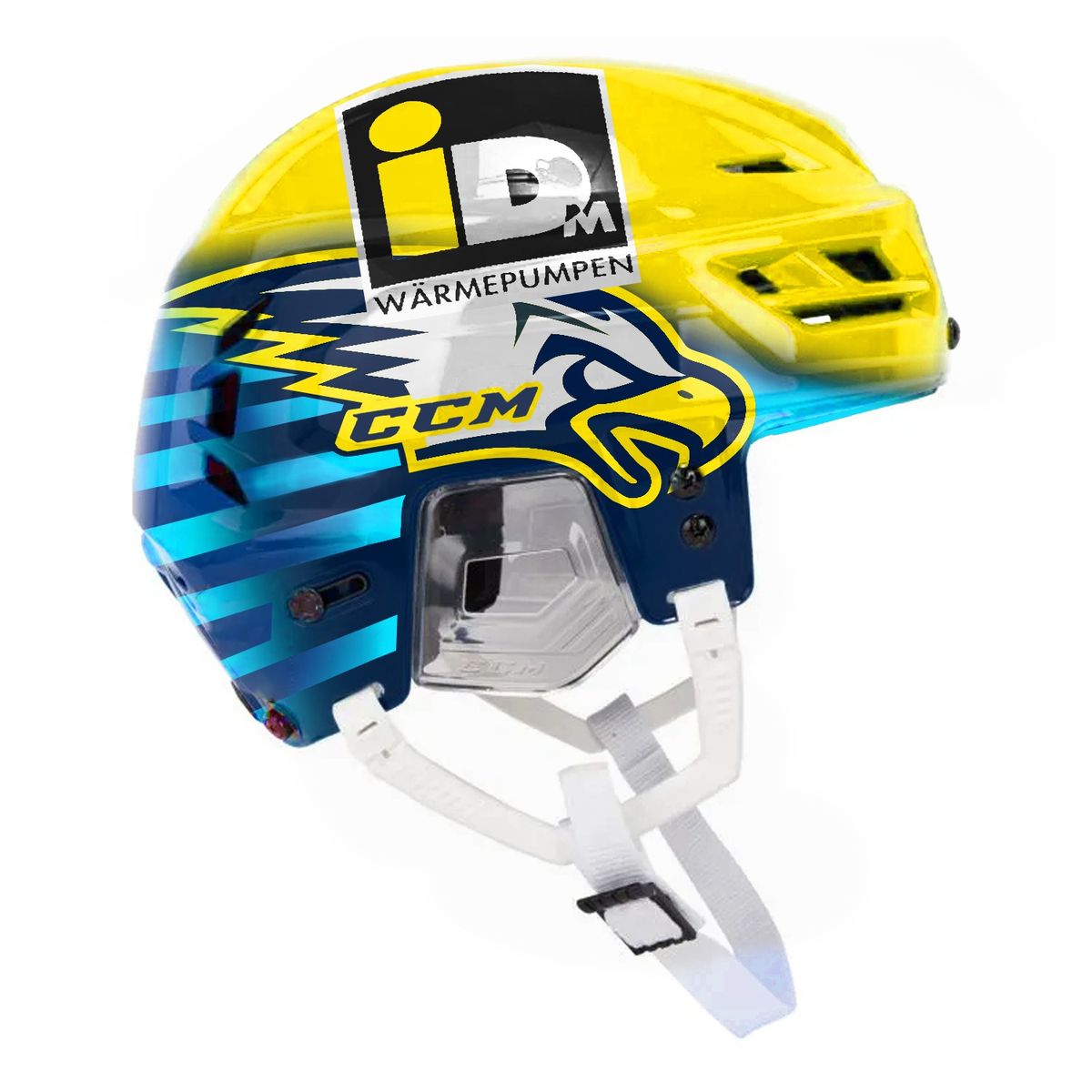 Der Helm per se, sieht eh gut aus, echt gelungen, außer vielleicht, dass euer Logo ein bisschen wie ein aufgeklebtes Pickerl aussieht, das hätte man mMn schöner integrieren können, aber da hatten wohl eure CI/CD-Verantwortlichen ein Problem damit (Stichwort Rahmen und Hintergrundfarbe). Ich verstehe aus eurer Sicht, dass ihr da auch optisch am Spieler hervorstechen wollt, nur ist mir da zu viel gelb für den VSV. Alles sollte mMn blau/weiß sein.