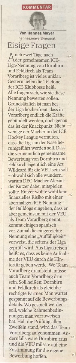 Mayer schreibt heute in der Neuen, dass es sein könnte, dass im Grunde genommen am Ende dieses Schauspiels kein Vorarlberger Team mehr in der Liga vertreten sein könnte. Dann nämlich, wenn sich dieses Team Vorarlberg als „Einstieg der VEU über die Hintertür“ entpuppt. Die Liga prüft und wenn am Ende dieser Schluss naheliegt wäre Dornbirn raus und Feldkirch benötigt wie gehabt eine positive Abstimmung der Liga, die ja letztes Jahr nicht nur an Dornbirn gescheitert ist.