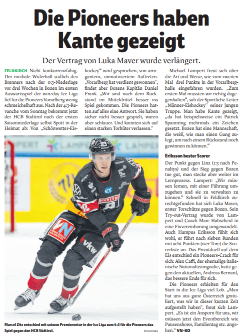 Von vorneherein war klar, die Pioneers werden es sehr schwer haben gegen den Vizemeister. Die ersten beiden Drittel haben sie gut verteidigt, aber leider die paar Chancen die sie hatten nicht genutzt. So war es voraus zu sehen, dass es im letzten Drittel schwer werden wird. Und wie schon in den vorangegangenen Spielen waren es die fehlenden Körner in der dritten Spielzeit die das Ganze entschieden.