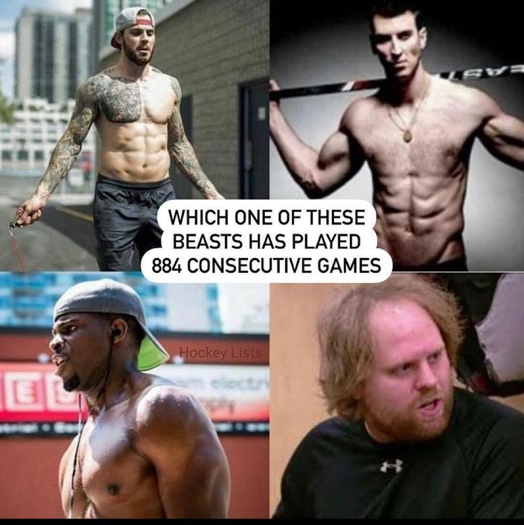 Phil Kessel spielt seit Oktober 2009 !! ohne Unterbrechung jedes Spiel seines Teams in der NHL ... auch wenn man hin und wieder über sein Gewicht lacht ... schon eine unglaubliche Serie ... Gratulation!