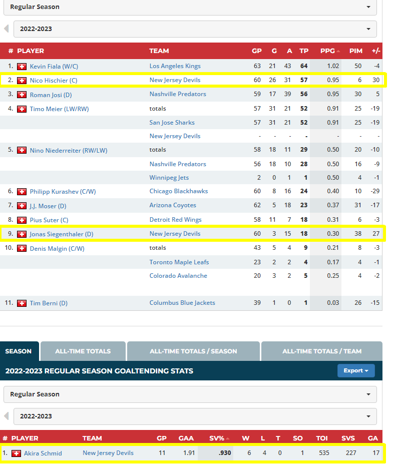 Auch Siegentaler mit einer +27 und dazu Akira Schmid mit 22 Jahren eine SV von 0.93 in seinen bisherigen elf NHL Spielen.