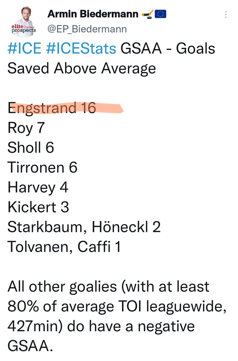 Neben der ligaweiten Nr.1 in der Save-% (93.3) zeigt auch die GSAA-Statistik eindrucksvoll, wie wertvoll Engstrand für die 99ers ist :