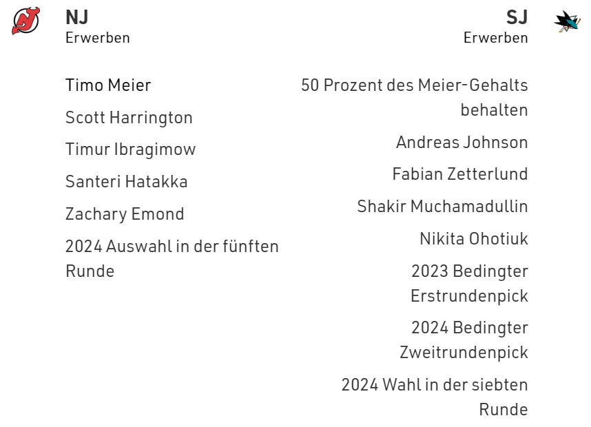 Der deal ist durch und kurz gesagt (einen längeren bericht habe ich im allgemeinen NHL thread geschrieben), die spieler welche von SJ außer Meier kommen sind mehr oder weniger wertlos und mit den abgegebenen spielern kann ich eigentlich ganz gut leben, Zetterlund tut mir ein wenig leid, aber das hätte weit schlimmer kommen können..