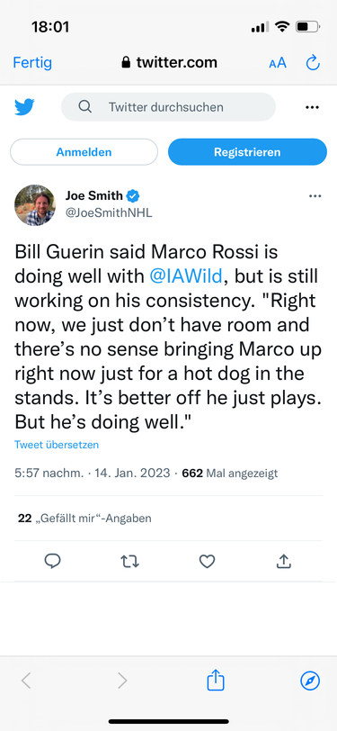 Ich hab das Gefühl, dass Rossis Call Up näher und näher rückt. Die Wild performen aktuell eher mittelmäßig - nur 10 5vs5 Tore in den letzten 9 Spielen - und könnten frischen Wind im Line-Up gut gebrauchen. Steel als Center der 1. Linie ist eine absolute Vorgabe mit 0 Punkten in den letzten 7 Spielen und gesamt nur 7 Torschüssen - und das mit Kaprizov und Zuccarello als Linemates. Find ich übrigens auch interessant, dass Evason bei Rossi immer was von "he has to earn it" daher geschwafelt hat, aber bei anderen schaut er ewig zu ohne Konsequenzen zu ziehen.