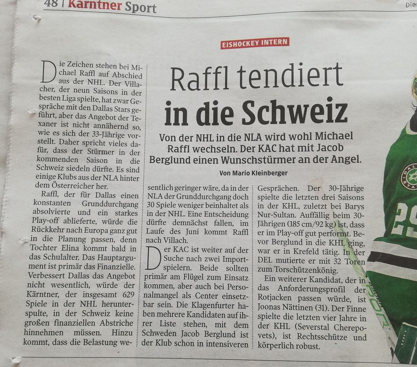 Da geht es ja nicht darum, einen Raffl irgendwie schlecht zu reden, aber in der NLA laufen halt schon ganz andere Scorer-Kaliber herum, als es Raffl jemals war oder sein wird. Dass er sicher noch eine gute Rolle spielen kann, glaube ich auch, aber Toplegio im Sinne von Topverdiener und Topscorer traue ich ihm in dem Alter dort nicht mehr zu.