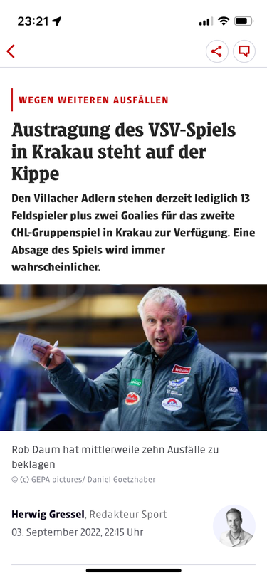 Ich glaub des wird heut a absage geben🙈 schade für Ali wäre es a Super sach gewesen in der CHL zu spielen! Aber es bringt ja nix wenn soviel krank sind.
