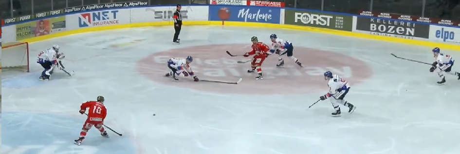 2. Das 1:0 für Bozen: Standardsituation in der neutralen Zone. Bozen erkämpft den Puck, Innsbruck sofort aus der Position. Der Bozner auf der linken Seite zieht allein zum Tor.