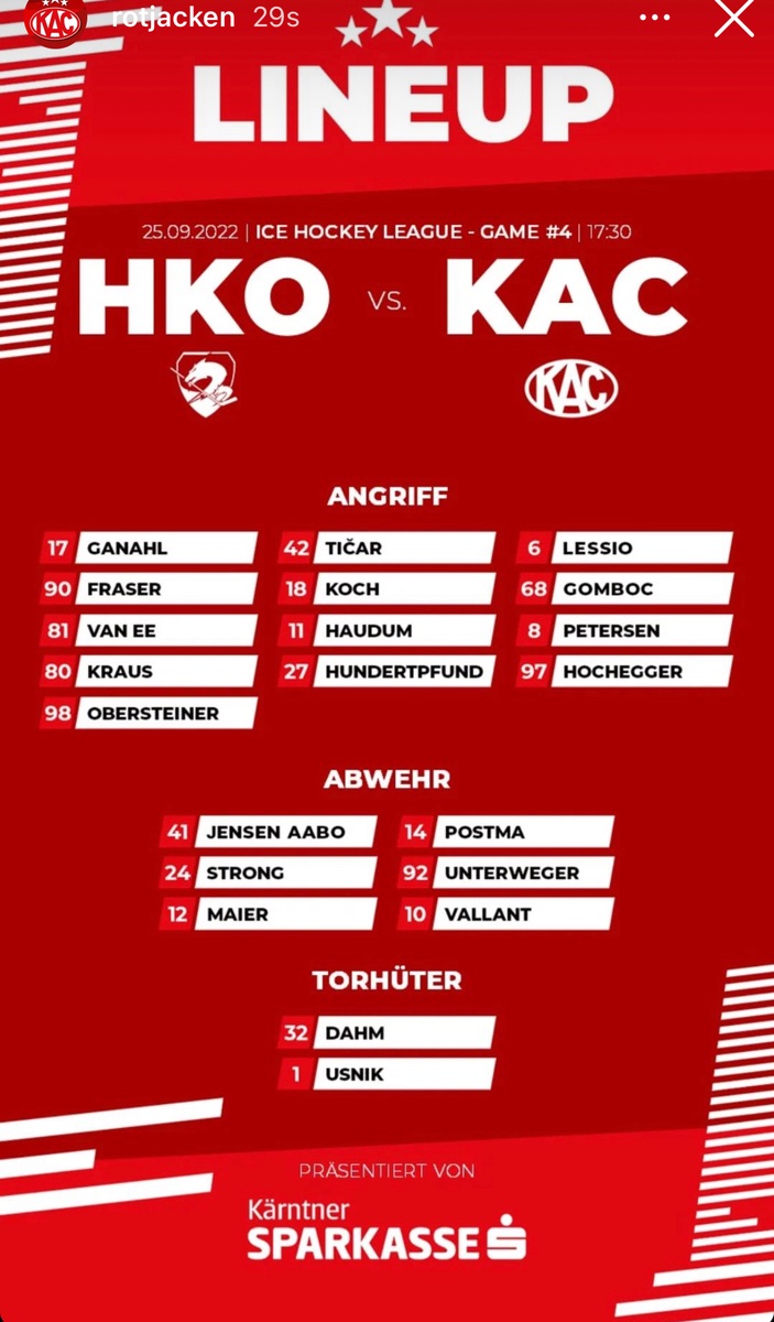 Gegenüber der Partie vom Freitag gibt’s nur in einer der vier Sturmlinien Veränderungen: Lukas Haudum rückt auf die Center-Position und wird von Finn van Ee und Nick Petersen flankiert. Luka Gomboc bleibt nach seinem starken Debüt also in der Linie mit Koch/Fraser. #HKOKAC