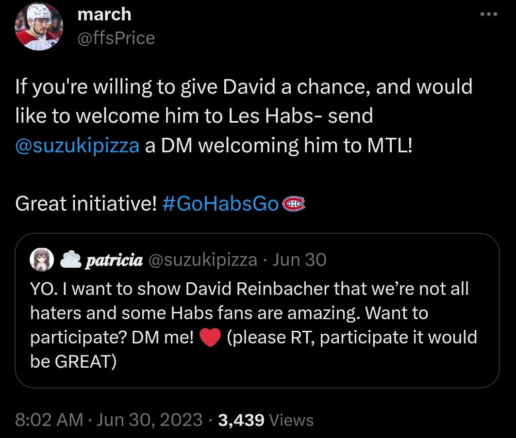 Ich wünsche allen Leuten in Montreal, die mit einem Shitstorm über David drüberziehen einfach, dass sie irgendwann mit aller Vorfreude in ein entscheidendes Habs Playoffspiel gehen und dann genau wegen eines Hattricks von Reinbacher, der zu diesem Zeitpunkt für das andere Team spielt, rausfliegen und dann in den Spiegel sehen nur um zu erkennen welch wertloser Stück Abfallhaufen sie doch sind.