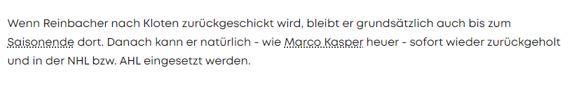 Ein Zwerger war vor seinen 2 Gehirnerschütterungen sogar ein Thema für die NHL, war von vielen Schweizer Clubs umworben. Also wenn man da noch Zweifel bezüglich seiner Klasse hat, dann weiß ich auch nicht. Rohrer wurde von den ZSC Lions zurückgeholt, hat auch jede Menge Aussagekraft. Außerdem war er mit Reinbacher heuer wieder im Camp, also trotz allem eine Zukunftsaktie der Canadiens. Und in dieses Camp musst du es erst mal schaffen. Und außerdem weiß der Staff der Canadiens das Können eines Spielers besser einzuschätzen als wir alle hier.