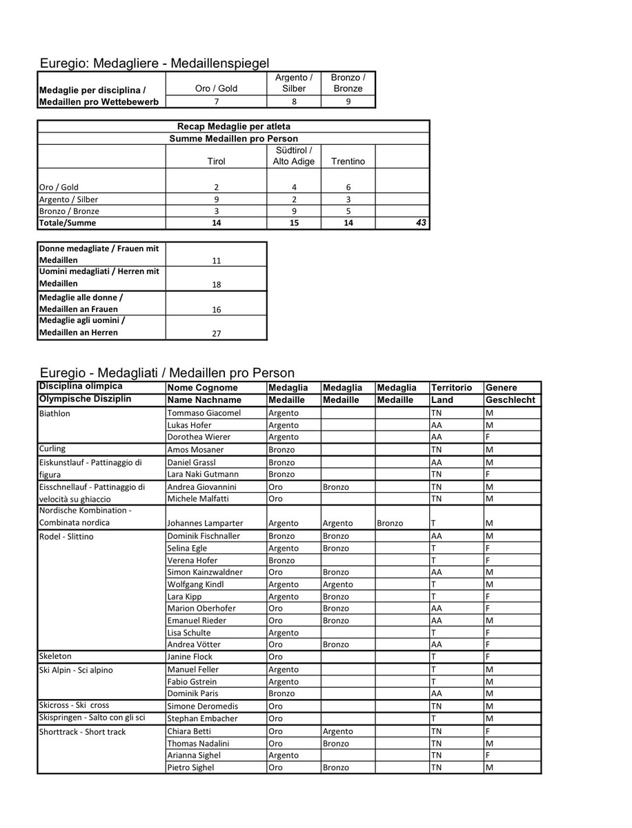 Süd- und Nordtirol haben „gemeinsam“ 29 Medaillen geholt. Zusammen mit Welschtirol, also die so genannte Europaregion Tirol, sogar 43 Medaillen