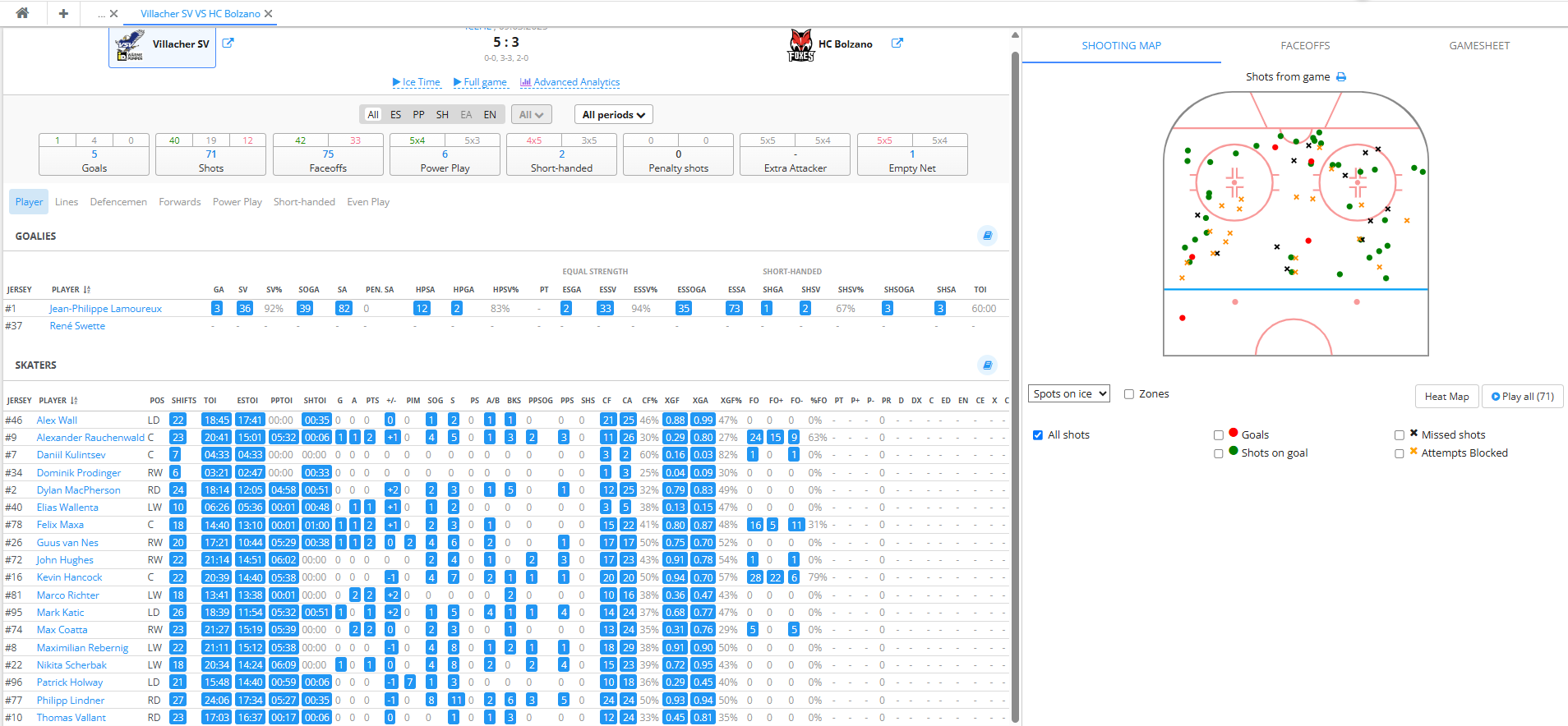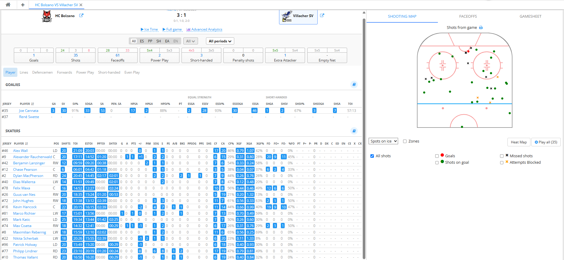 Ich hab zwar nicht das ganze Spiel gesehen am Freitag, aber wenn man sich die Statistik ansieht, dann war da Bozen schon überlegen. Da hat fast keiner unserer Spieler einen positiven Corsi und die expected goals sprechen eigentlich auch klar für Bozen; sowie die shot map. Ich bin eher verwundet, dass man so lang so gut im Spiel bleiben konnte.