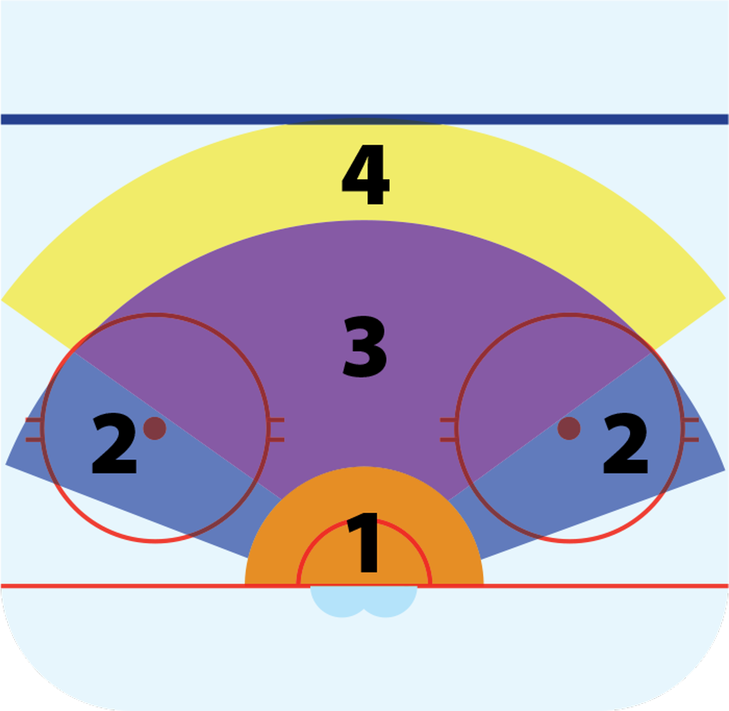 Corsi: Wir unterscheiden, von welcher Position ein Schuss abgegeben wird (siehe Grafik; diese entspricht nicht unserer Grafik sondern ist ein gängiges Modell) und welche Qualität die Torchance hat. Jeder abgegebene Schuss wird also mit mehreren Faktoren auf- oder abgewertet und ergibt dann einen Wert zwischen 0 und 2. Dadurch können wir Corsi-Werte besser einordnen und gewichten - prinzipiell kann nämlich ein Spieler mit 80% Corsi eine schlechtere Performanz als ein Spieler mit 45% Corsi geleistet haben. Natürlich müssen diese Werte auch an die Time on Ice adaptiert werden.