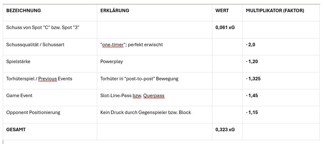 - Frühere Ereignisse (sind die Spieler schon lang in der eigenen Zone, Goalie Position etc.)