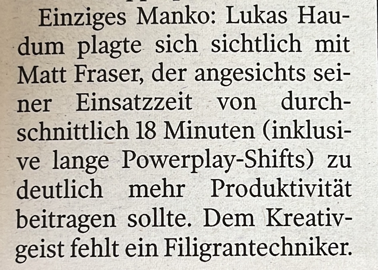 Vor allem auch weil Fraser komplett auslässt. Vielleicht ist seine alte Verletzung wieder da (irgendwas war da, bevor er zu Dornbirn gekommen ist, machte er in Schweden nur 4 Spiele).