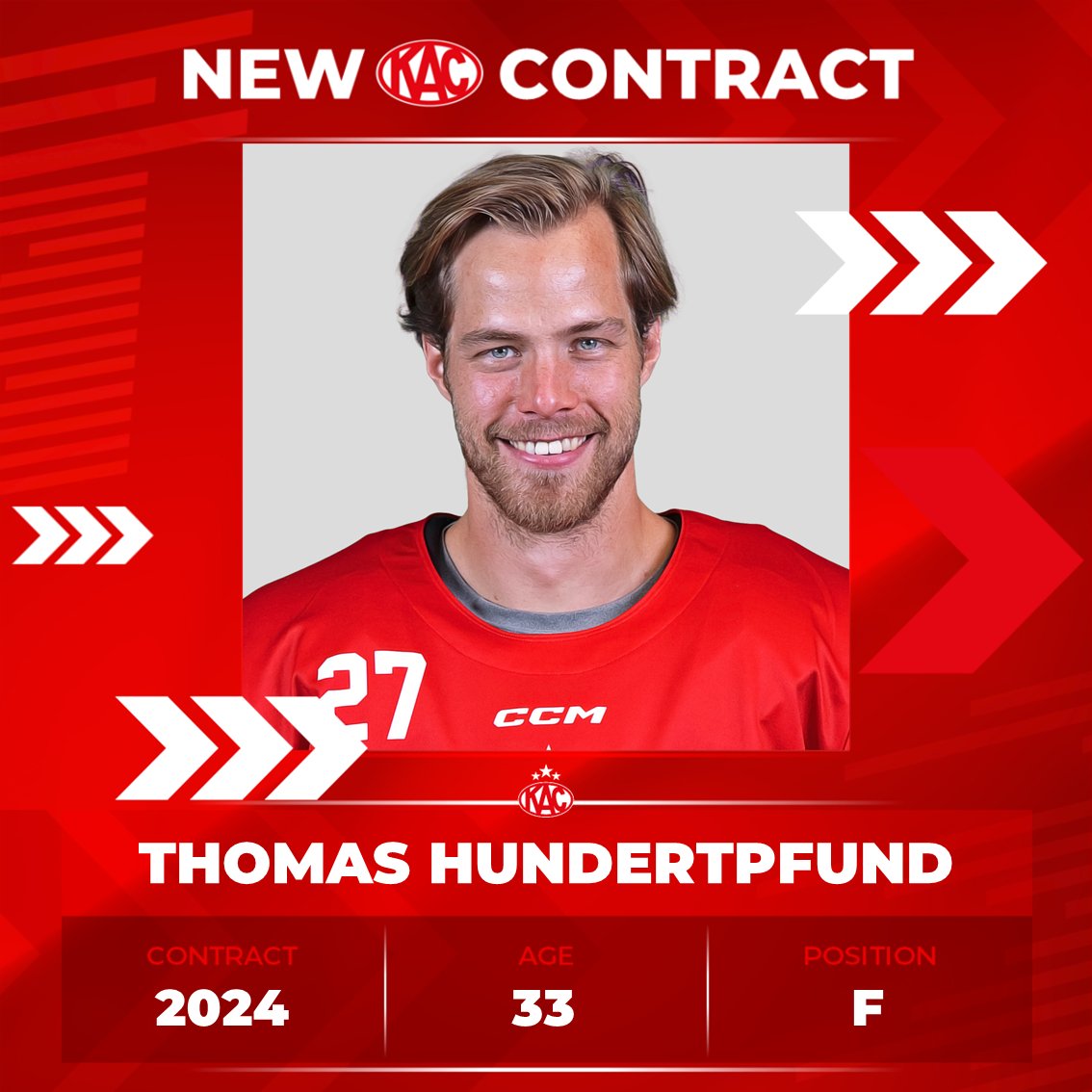 Im Kader für die Saison 2023/24 hat sich beim KAC etwas getan. Urgestein Thomas Hundertpfund wurde ein neues Vertragsangebot unterbreitet, was der Stürmer angenommen hat. Das Eigengewächs setzte seine Unterschrift unter einen vorerst auf ein Jahr befristeten Kontrakt. Der 33-Jährige bestritt bisher für die Rotjacken in der Liga 823 Spiele und 22 Begegnungen in der Champions Hockey League, kam dabei auf 148 Tore und 265 Assists. Dabei kam der Familienvater auf ein +134 Bilanz. „Hundertpfund gehört seit eineinhalb Jahrzehnten zum Stamm unseres Kaders und insbesondere in den entscheidenden Phasen der Meisterschaft sieht man Jahr für Jahr, warum er bei seinem Stammverein diesen Stellenwert genießt. Er ist ein sehr vielseitiger Spieler ohne große Schwächen, agiert verantwortungsbewusst und hat als Teil von vier Meistermannschaften schon häufig bewiesen, dass er weiß, wie man zu Erfolg kommt“, nennt Pilloni einige Gründe, warum der KAC weiter auf den Allrounder setzt. Der Mann mit der Rückennummer 27 zeigt sich glücklich über die Vertragsverlängerung. „Ich bin froh, dass ich noch ein weiteres Jahr bei meinem Heimatverein spielen kann.“