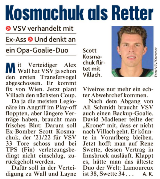 Darauf angesprochen, entgegnet Schumnig: "Es ist alles offen. Dazu kann ich noch nichts sagen." Und: "Mein Vertrag bei den Black Wings läuft noch bis 30. April." Rauchenwald meint dazu: "Er ist aktuell noch Linzer, wir haben uns noch nicht mit ihm befasst." Dem VSV würde Schumnig mit seiner Spielweise (und Führungsqualitäten) einige Optionen bieten. Zumal es für ihn kein Scouting benötige, er keine Wundertüte wäre – wie so mancher Neuzugang. Rauchenwald bleibt vage: "Es stehen einige Spieler zur Disposition."
