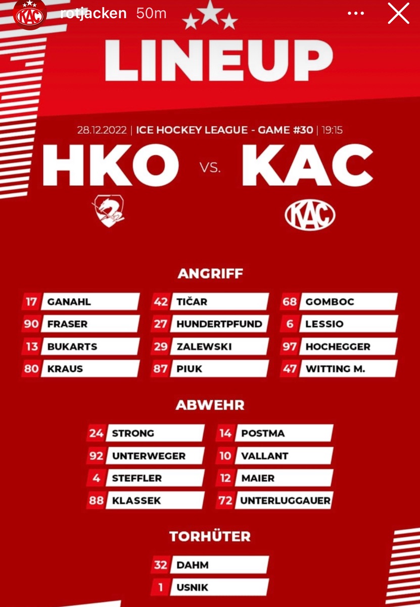 Aus der medizinischen Abteilung gibt’s positive Nachrichten: Der gestern erkrankte David Maier ist heute einsatzfähig und kann auflaufen, damit sind alle 20 Spieler vom Montag mit dabei, als zusätzliche Kräfte stehen Klassek und Unterluggauer im Lineup.