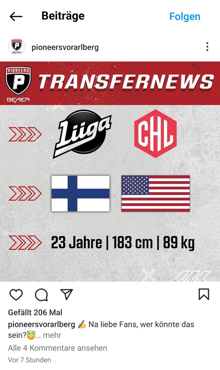 bleibt abzuwarten ob der "Finnische Topstürmer" seinen Erwartungen gerecht werden kann wenn man sich seine Statistik auf Eliteprospect ansieht bleibt es spannend. Hoffentlich schlägt er ein, würde den Pioneers sicher gut tun.