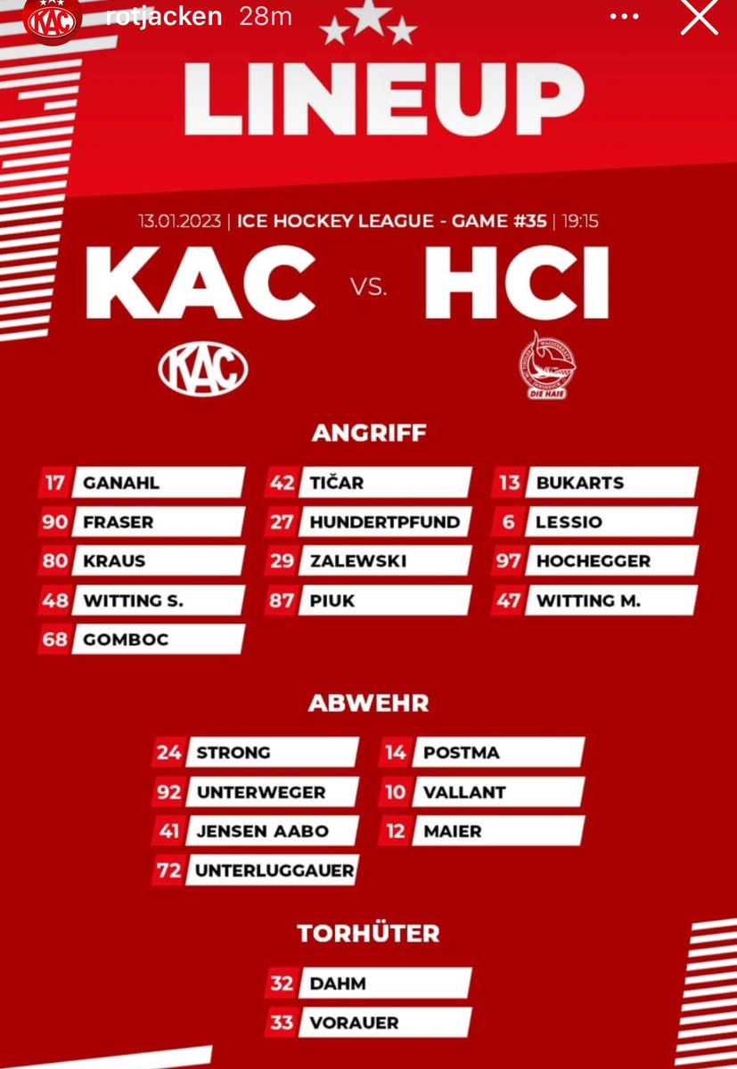denke das könnte heute ein interessanten Spiel werden . ein ausgeruhter KAC gegen mit Selbstvertrauen voll gepumpte Haie, bei denen WInkler und der erkrankte Ulmer fehlen werden. Für Swette wäre es ein Highlight auflaufen zu dürfen und hätte es sich auch verdient,galube aber eher nicht daran .