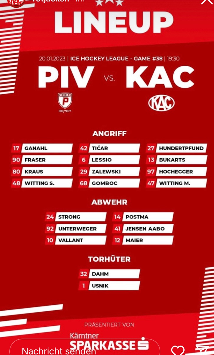 Biel gegen Genf ebenfalls live, aber für mich keine Frage welches Spiel ich mir reinziehen werde. Pioneers - KAC 8)