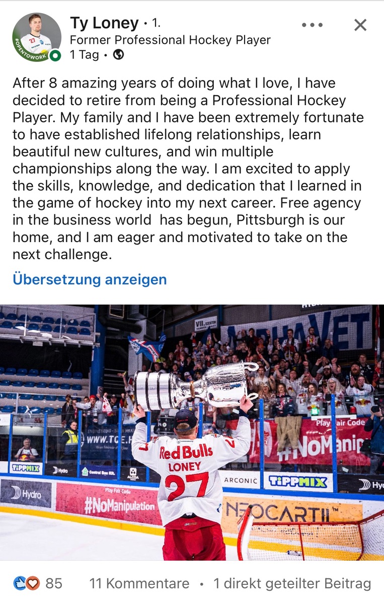 Retirement war hierorts seit der Meisterfeier bekannt. Nach den Gehirnerschütterungen das einzig Richtige. Hat zwar in Salzburg nicht viele Spiele absolviert, aber wenn er gespielt hat, war das große Klasse. Alles Gute für das Leben nach dem Eishockey.