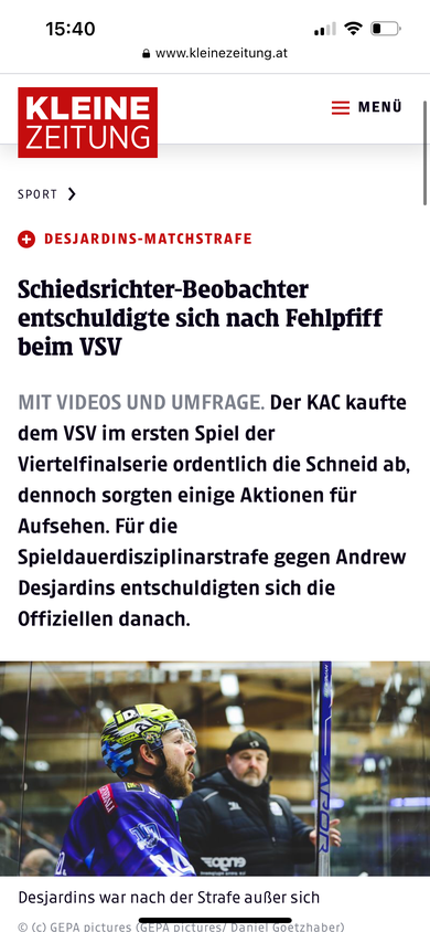 Der Schiri hat sich gestern bei Desjardins noch entschuldigt für dem Fehlpfiff!!!! Muss gestehen das ich in der Halle zuerst auch dachte das es ein Check gegen dem Kopf war. Sah das dort nicht so genau.