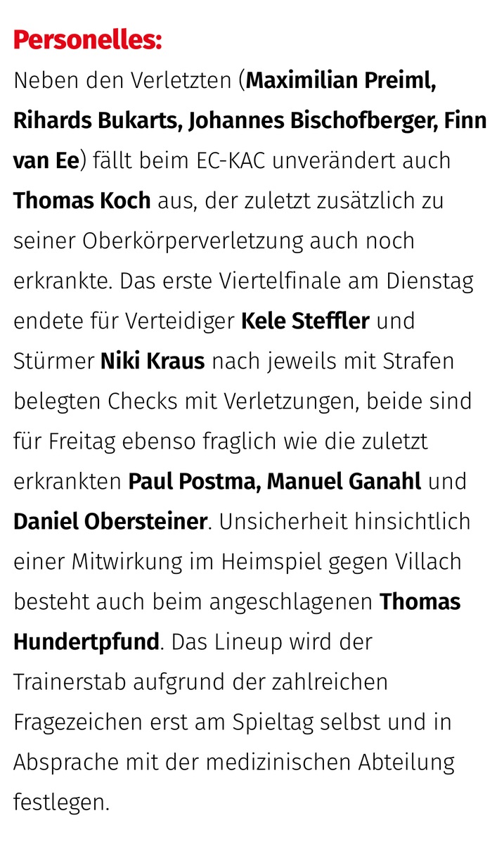 Steffler und Kraus out plus wohl 2 Kranke.
