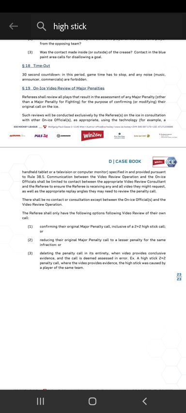 "Die Schiedsrichter haben die Option zur Überprüfung aller Spielsituationen, die zu einer Doppelten Kleinen Strafe für "Hoher Stock" führen können, um 1. den Entscheid auf dem Eis zu bestätigen, oder 2. den Entscheid zu annullieren.