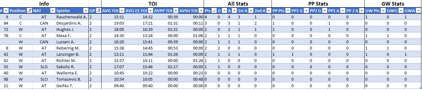 Sodala, hab gestern in den Drittelpausen und heute im Homeoffice mein Excel wieder auf Betriebstemperatur gebracht. Eigentlich wollte ich das ganze im +/- 10 Spiele Zyklus posten, aber nachdem ich derzeit dankenderweise die TOI auch zu Verfügung gestellt bekomme (und hoffentlich auch zukünftig werde) brauch ich dann doch noch etwas Input was den interessant wäre bzw. wie ihr manche Sachen Vergleichen würdet: