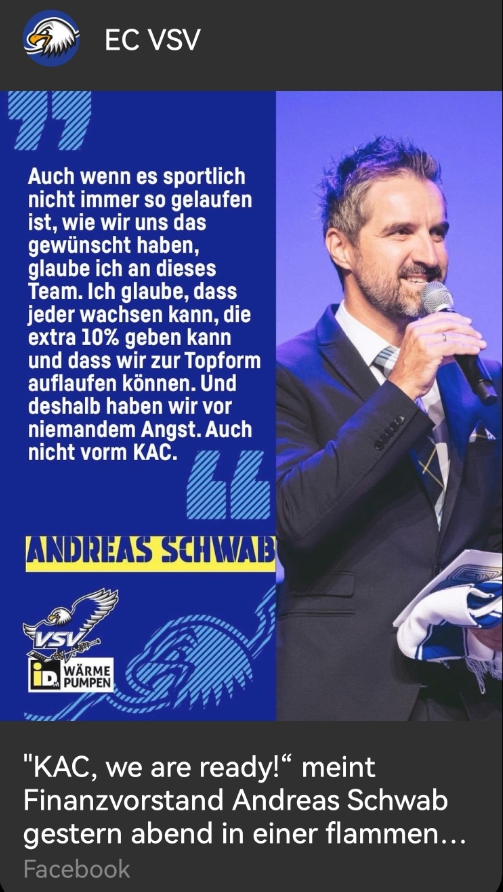 Da geht es vorallem um die Kommentare in den Social Medien, dass sich Schwabe diese sehr zu Herzen nimmt, ist ja bekannt. Und da kommen halt seit Wochen die Kommentare, man wird 0:4 gegen Klagenfurt unter gehen. Ich denke genau deshalb hat er diese Aussage getätigt, ich seh das jetzt auch nicht so schlimm und ehrlicherweise ists mir auch ziemlich egal ob KAC Fans sich darüber lustig machen...