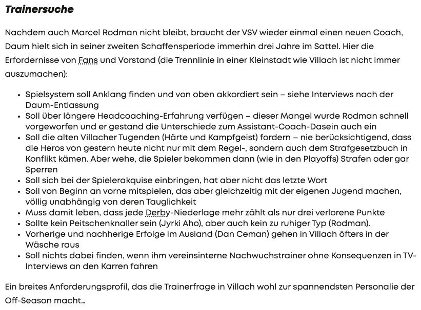 edit der Analyse selbst kann man sich eigentlich anschließen, warum es dann noch sein hat müssen ggn. Ende die Liste der Wunscheigenschaften eines Headcoachs so süffisant aufzulisten weiß ich allerdings nicht. Es wird vieles davon brauchen um in Villach erfolgreich zu sein, dass alles nicht gehen wird ist glaub ich klar, aber das alle diese Eigenschaften grundsätzlich wünschenswerte Eigenschaften sind, kann man denke ich nachvollziehen.