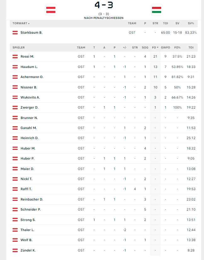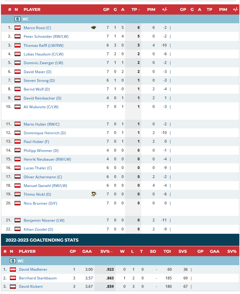 Alles in allem wurde das WM-Ziel erreicht auch wenn es mit Hängen und Würgen erreicht wurde. Und besonders freut es mich für Heinrich Starkbaum und Raffl. Und nicht vergessen mit Kasper fiel auch ein junger Bursche aus, der sicher für zusätzliche Spielakzente gesorgt hätte. Und abschließend erwähnt sei noch, dass es unumgänglich ist, zusammen mit Liga Verband und Teammanagement an einem Konstrukt zu arbeiten um die Causa Goalie in den Griff zu bekommen, denn sonst droht die durchgehende B-Zugehörigkeit. Die Schweiz hat dies ja vor Jahren schon vorpraktiziert