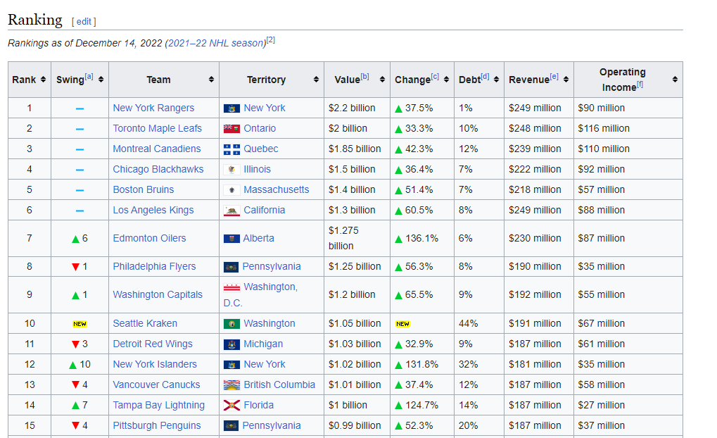 Interessant: man will kein Franchise mehr in Kanada, aber unter den 10 wertvollsten Teams sind 3 kanadische Teams (wir erinnern uns, 6 von 32 Teams sind aus Kanada). In den Top 15 sinds 4. Seattle ist auch gleich mal hoch eingestiegen, aber auch der 2.höchsten Schuldenstand. Detroit hat ordentlich Boden auf die anderen Original 6 verloren.