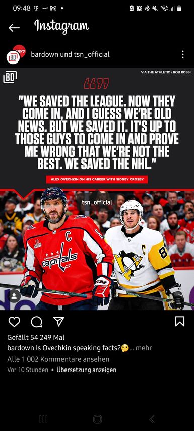 Ovi gestern mit einer interessanten Aussage. Hab heute schon mit einem Arbeitskollegen diskutiert. Er ist etwas älter und schaut entsprechend länger NHL und findet die Aussage absolut übertrieben. Ich für meinen Teil, denke, dass ich ohne die beiden wohl nie angefangen hätte die NHL großartig zu verfolgen, als ich jünger war, gabs faktisch immer die Frage "Ovi oder Crosby"...