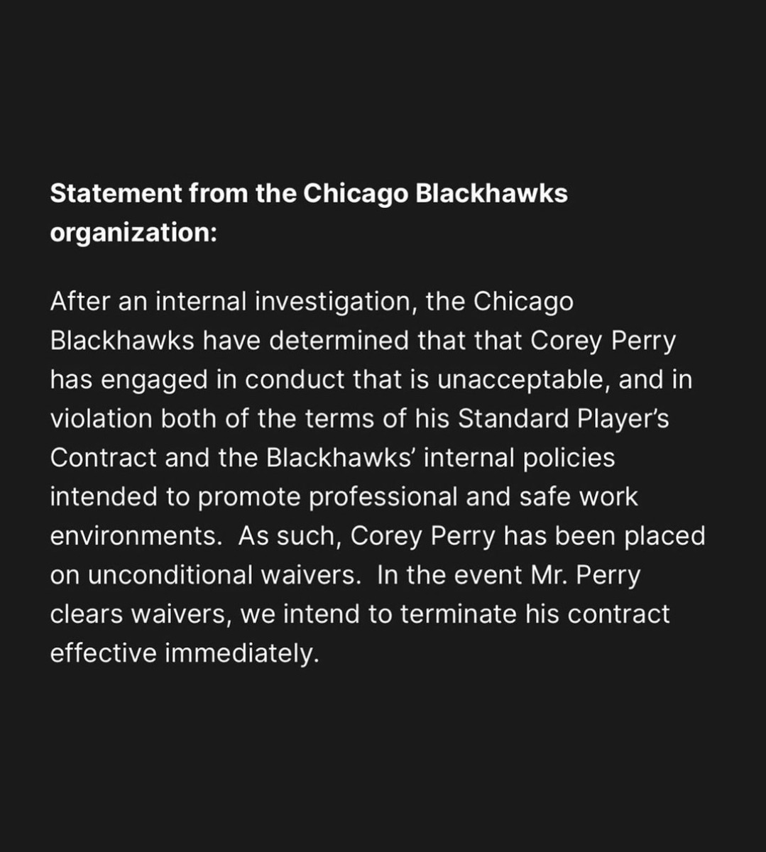 So, it appears something happened between Perry and a Blackhawks employee that the team deemed was unacceptable and broke the code of conduct.