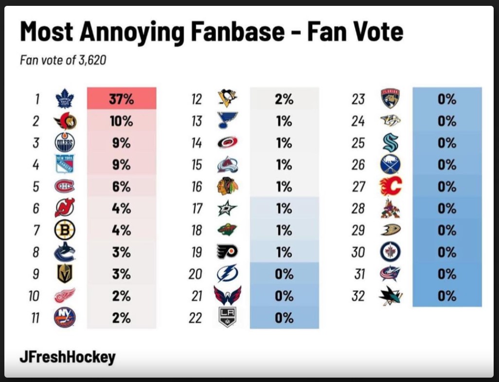 Here are the three most common fanbases picked as most annoying for each fanbase. The most common combinations were: Habs fans disliking Leafs fans Canucks…