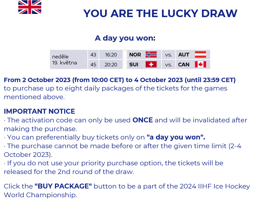 Hat schon jemand eine Verständigung erhalten? Und wenn ja, welche? Ich hatte mich für 3 Spieltage angemeldet und 1 davon darf ich jetzt vorab erwerben. Leider kein "Tschechien Tag".